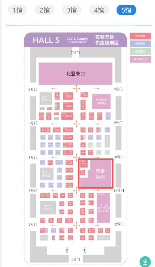 接下来再看看5号馆,因为5号馆有我们精心设计的居家检测展区,所以必须得跟大家浓重介绍一下,这次居家展区占地1000平,聚集了120家企业,而且京东健康、抖音电商以及很多从事互联网运营的公司和平台都来了。所以来CACLP参观,一定要来5号馆,看看,这里的内容,绝对不少。