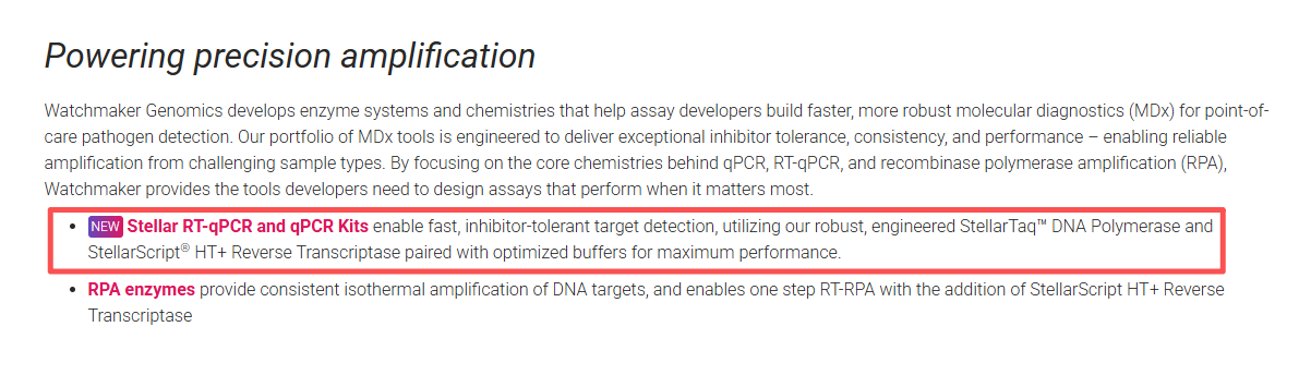 最近关注到,就在刚刚过去的慕尼黑举行的欧洲临床微生物学与传染病学大会上,专注于做酶学开发和研究的Watchmaker Genomics推出了Stellar系列RT-qPCR与qPCR试剂盒。该系列产品凭借高抑制剂耐受性和快速扩增能力,