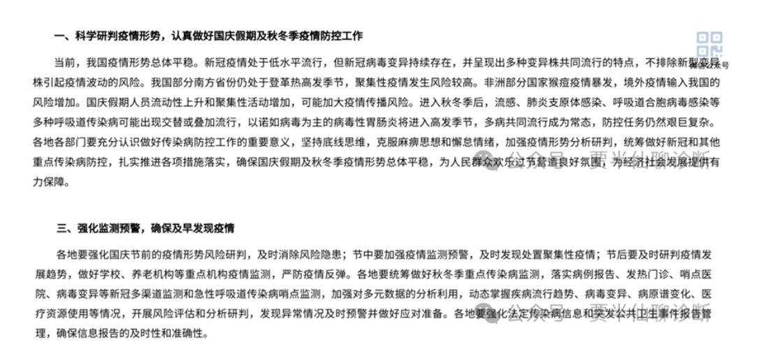 在最新的关于做好2024年国庆假期及秋冬季新冠病毒感染等重点传染病防控工作的通知》中也提及。