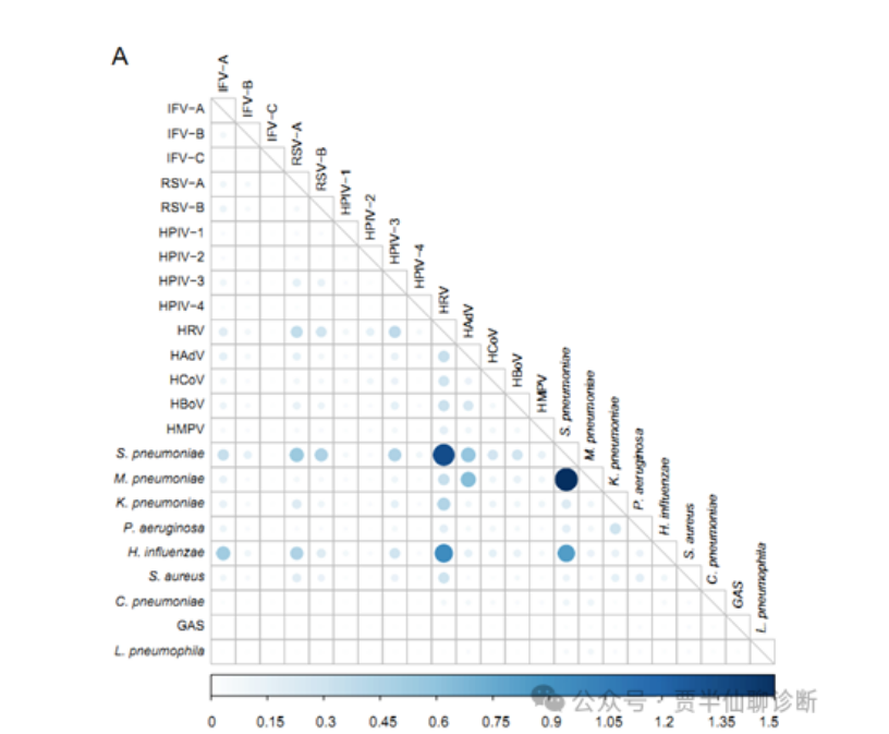 下面图片CDC发布的2009-2019数据,其中研究多种ARI的病原体混合感染的情况,图中是圆圈颜色越深,圆圈越大代表交叉(混合)感染可能性越大。