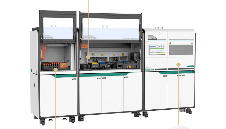 从产品定位上看,这款产品自称为分子诊断实时检测流水线,集样本分杯、核酸提取、体系配置、PCR扩增及结果分析为一体的全流程、全自动核酸检测系统。