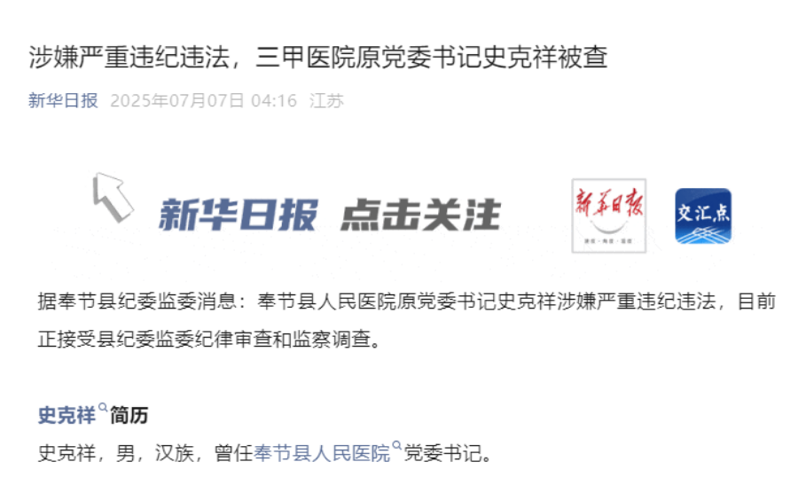 新华日报:据奉节县纪委监委消息:奉节县人民医院原党委书记史克祥涉嫌严重违纪违法,目前正接受县纪委监委纪律审查和监察调查。