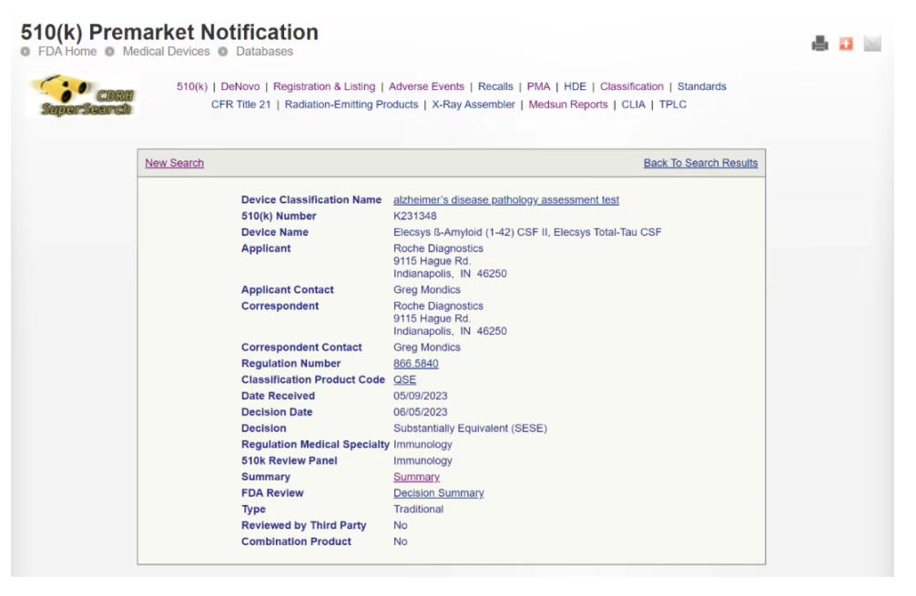 当前在美国没有FDA批准的阿尔茨海默症血液检测,只有一款脑脊液检测的Roche Elecsys -Amyloid (1-42) CSF II; Elecsys Total-Tau CSF在今年6月获得FDA 510(k)的批准(K231348)