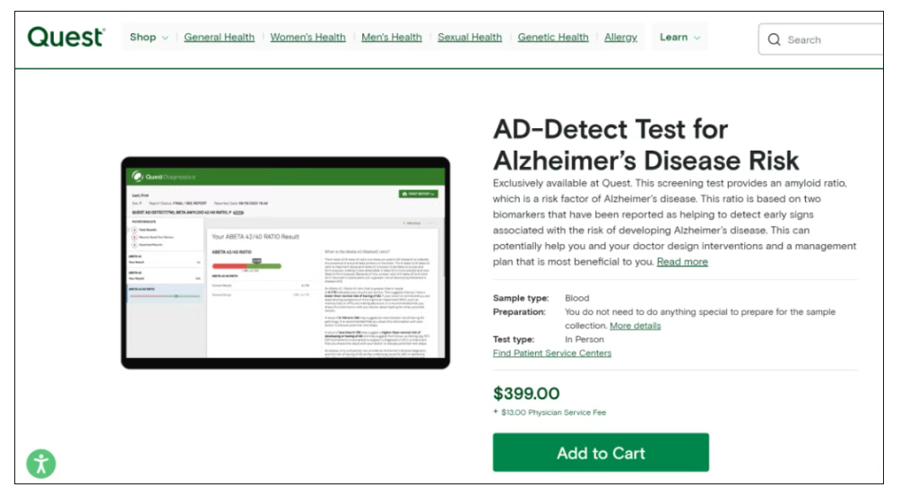 AD-Detect Test在Quest公司网站上销售,零售价为399美元(当下优惠至299美元),外加13美元的医生费