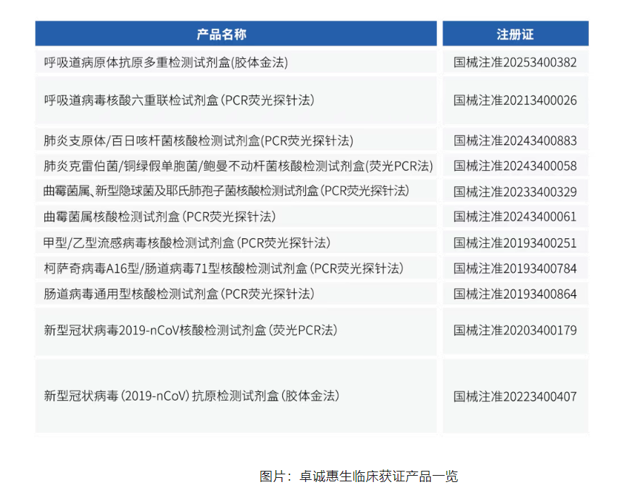 卓诚惠生在呼吸道病原体检测领域积累多年,已经建立了丰富的呼吸道产品矩阵,并形成了自己的独特产品优势和竞争壁垒。除了早期经典的拳头产品“呼吸道病毒核酸检测六联检”和“甲乙流核酸检测”,以及2023年获批的真菌三联PCR检测试剂盒,2024年更是连续获批三证——HAP细菌三联检、曲霉单项检测、肺支/百日咳双联检。