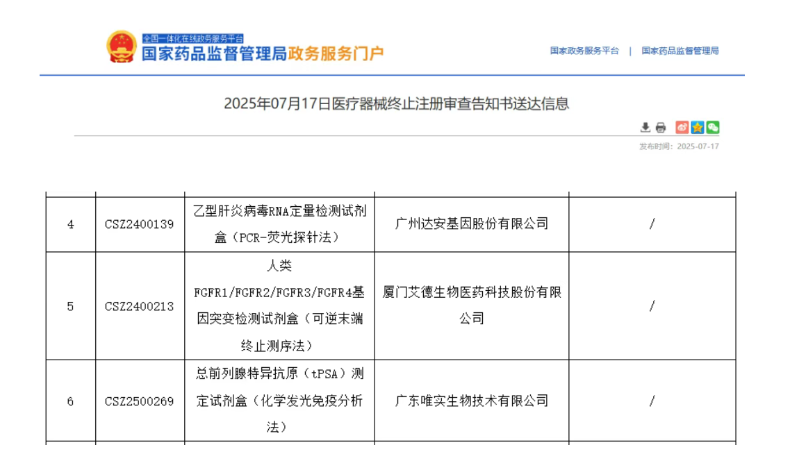 7月17日,国家药监局发布的“医疗器械终止注册审查告知书送达信息”中,有3款IVD领域产品终止注册,具体内容如下:
