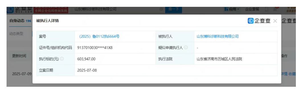 7月8日,山东省济南市历城区人民法院发布针对山东博科诊断科技有限公司发布公告,列入被执行人,执行金额603,947.00元!