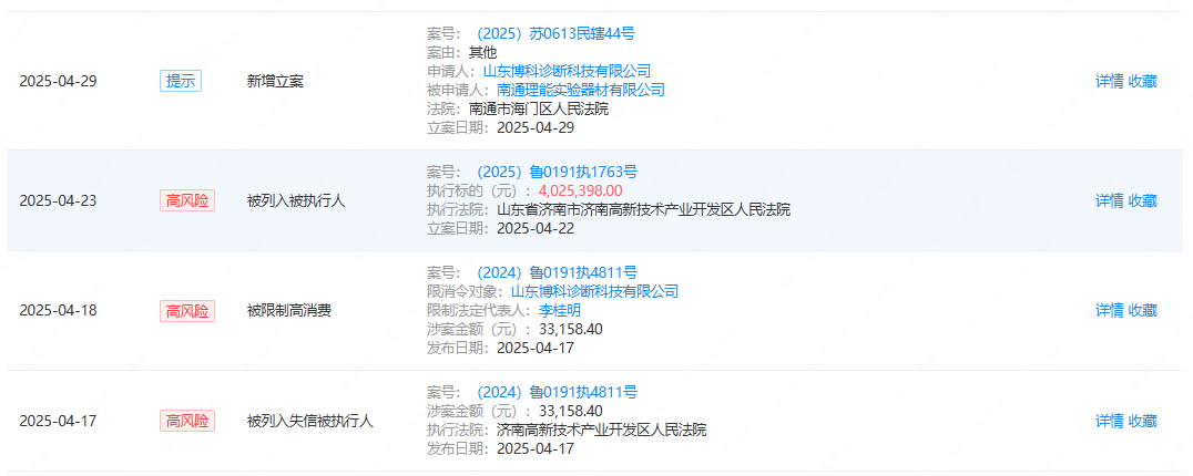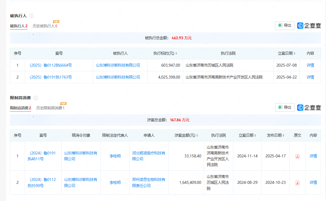 此前4月,山东博科诊断曾陆续被列入失信被执行人以及限制高消费,其中4月23日被执行金额高达402万。累计被执行金额442.93万。