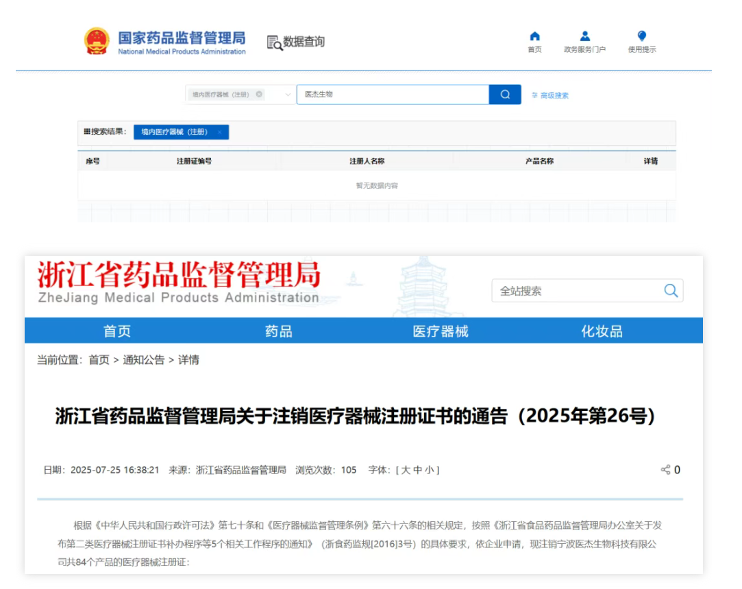 根据《中华人民共和国行政许可法》第七十条和《医疗器械监督管理条例》第六十六条的相关规定,按照《浙江省食品药品监督管理局办公室关于发布第二类医疗器械注册证书补办程序等5个相关工作程序的通知》(浙食药监规[2016]3号)的具体要求,依企业申请,现注销宁波医杰生物科技有限公司共84个产品的医疗器械注册证: