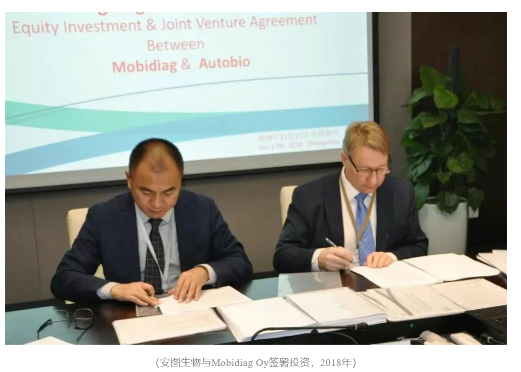 2018年12月15日,安图生物与Mobidiag Oy签署投资《合资合同》(JVC),共同出资在中国设立合资公司郑州安图莫比分子诊断技术有限公司,其中安图生物以货币出资800万欧元持股65%,Mobidiag以货币出资430万欧元持股35%。2019年5月17日Mobidiag与安图莫比签署《许可、开发和分销协议》(LDDA), Mobidiag授予安图莫比在约定区域内商业化初始产品的权利。