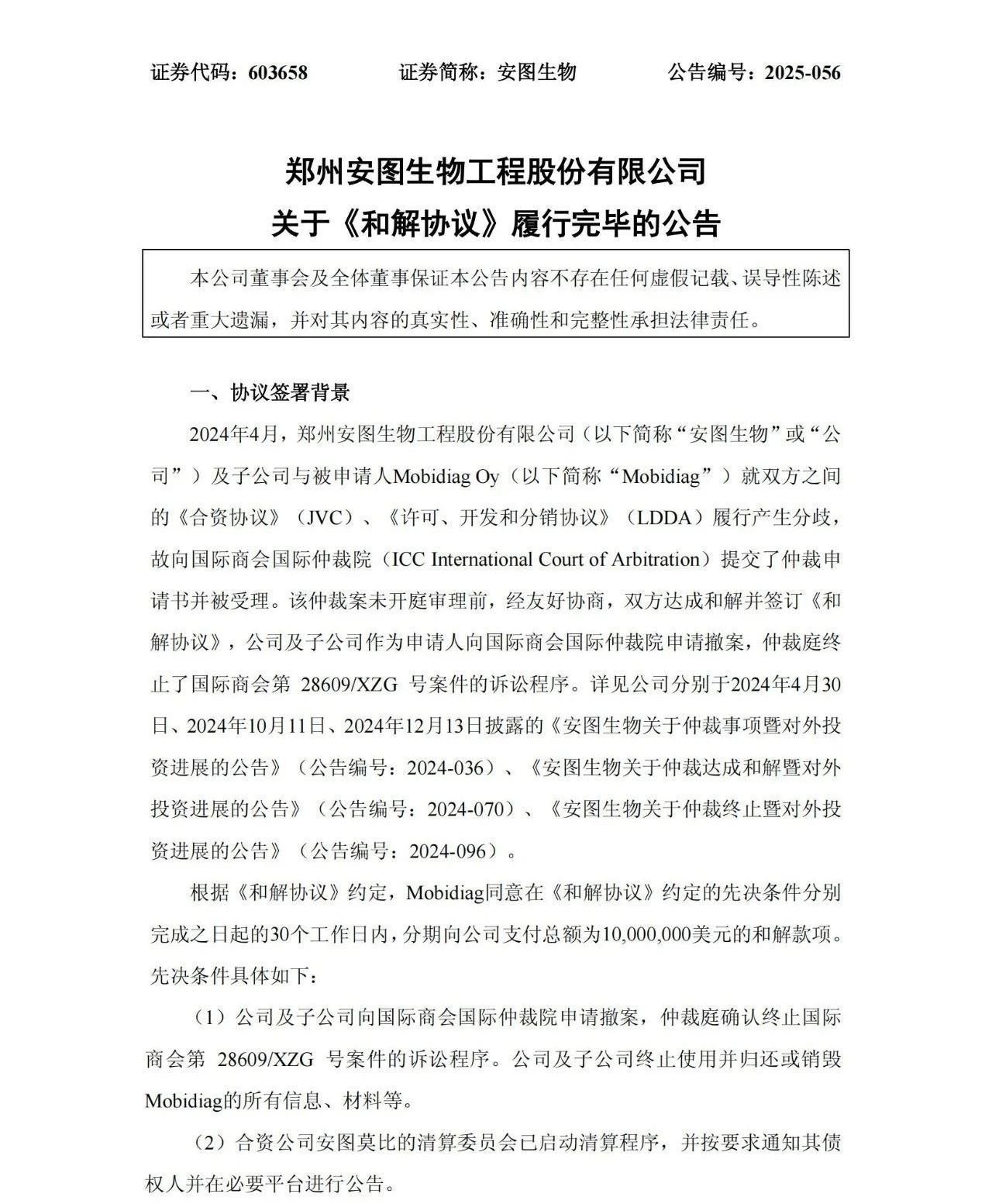 7月28日,安图生物发布公告,关于《和解协议》履行完毕的情况。公司及其子公司与Mobidiag就《合资协议》和《许可、开发和分销协议》的履行产生分歧,向国际商会国际仲裁院申请仲裁。