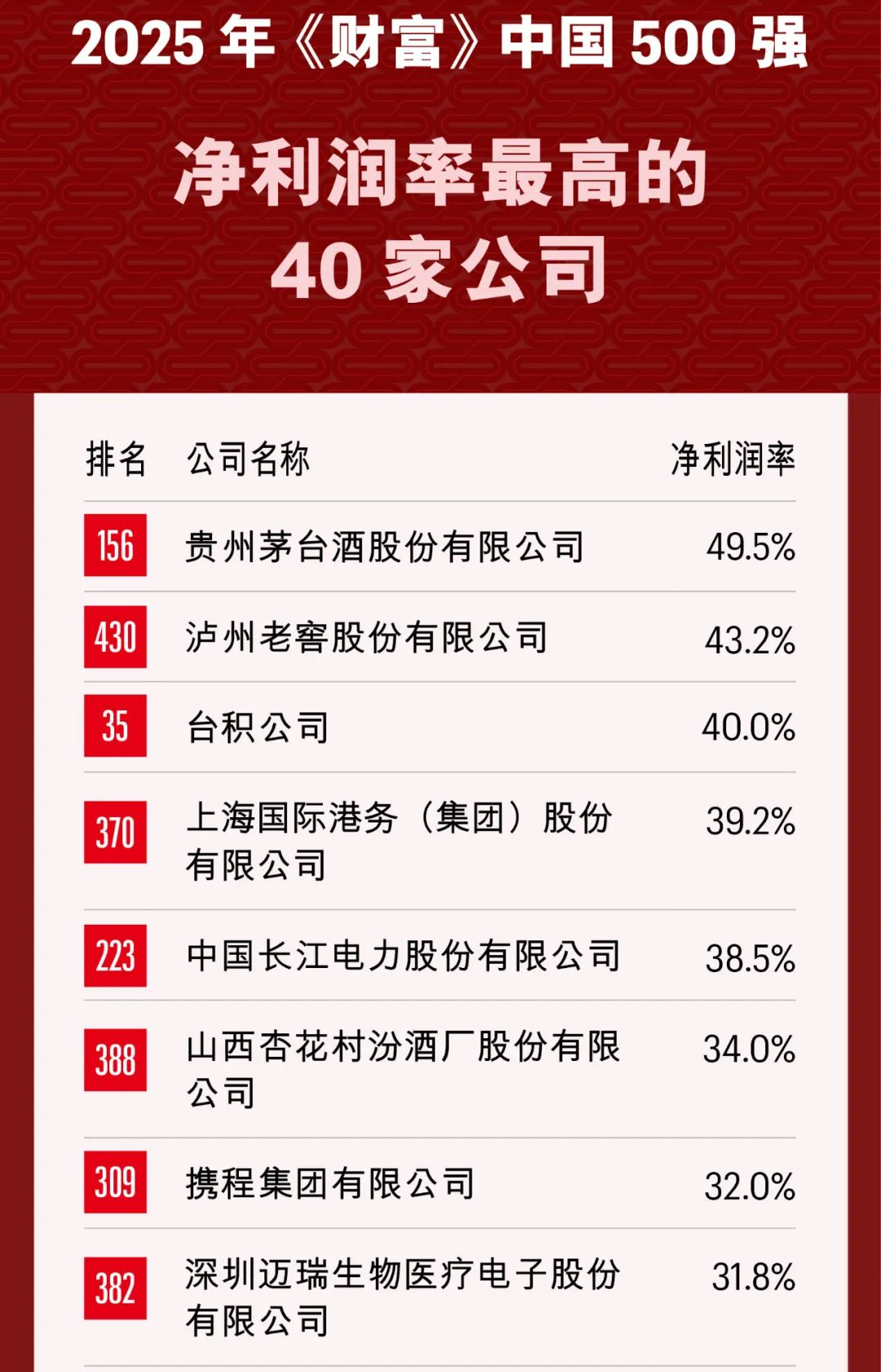 此外,在“2025年中国500强净利润率最高的40家公司”这一子榜单中,迈瑞医疗以净利润率31.8%位列第8位。