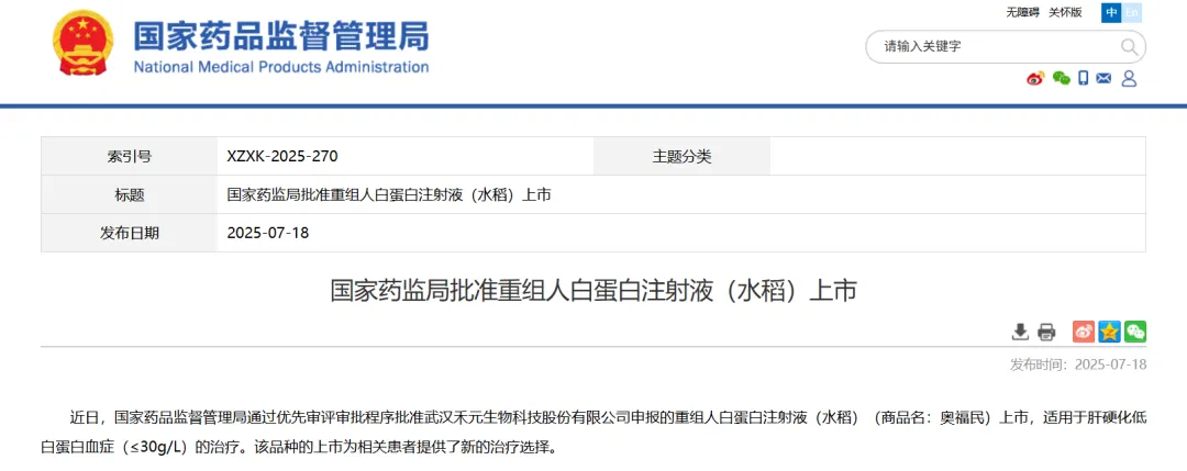 湖北武汉禾元生物科技股份有限公司自主研发的重组人白蛋白注射液(水稻),日前获国家药品监督管理局批准上市,适用于肝硬化低白蛋白血症的治疗,规模化生产后将造福患者。