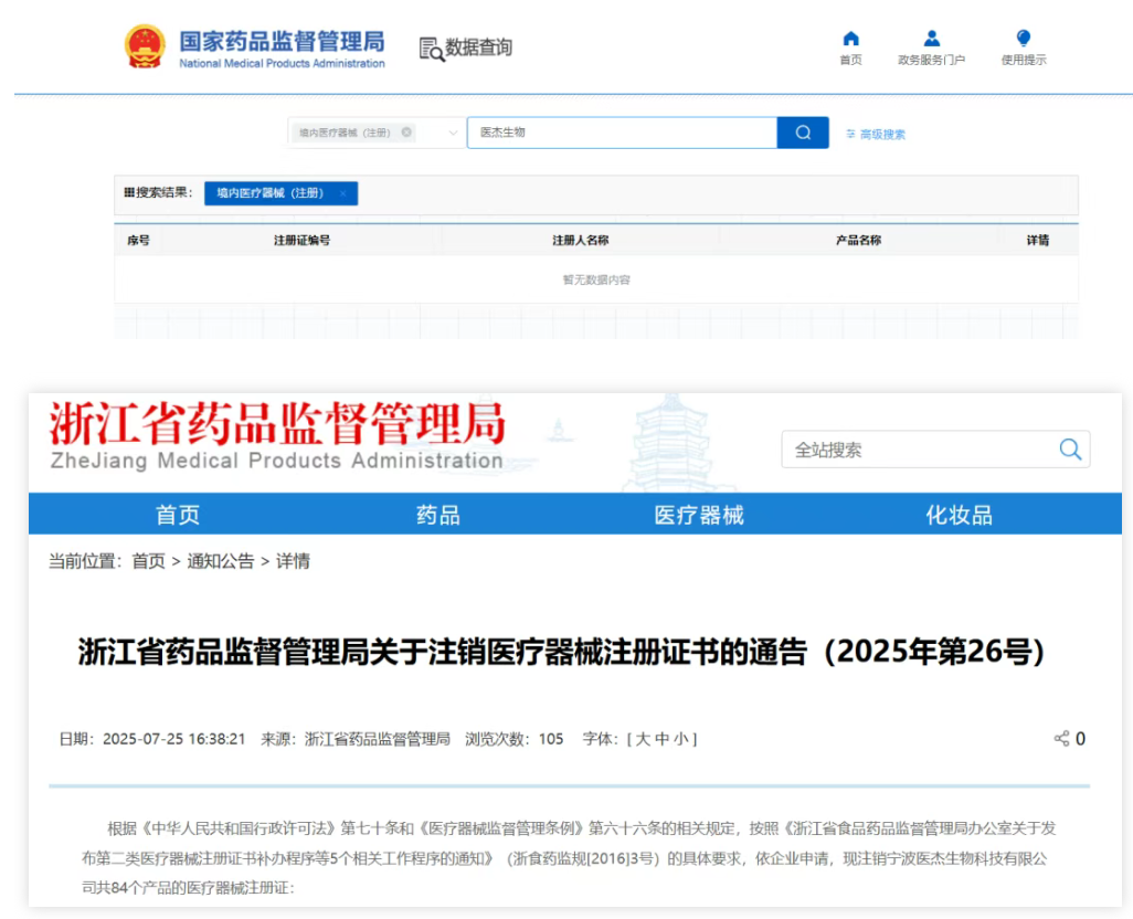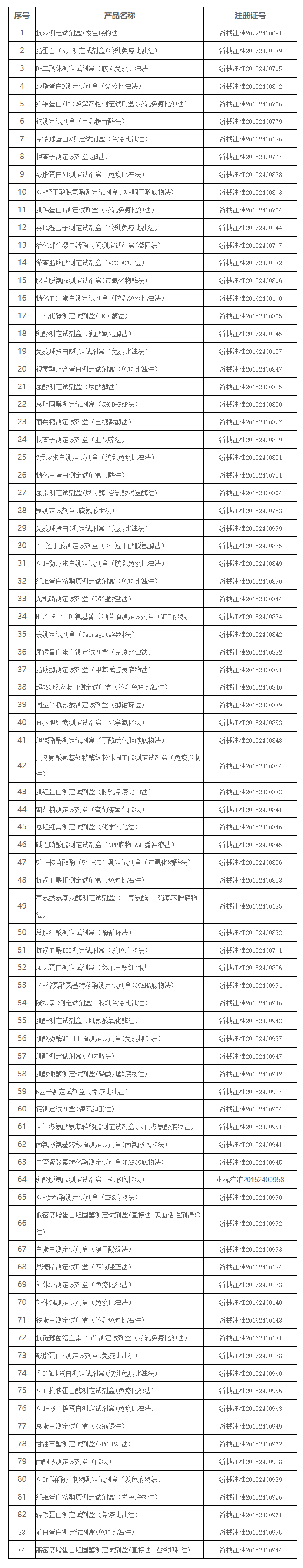 根据《中华人民共和国行政许可法》第七十条和《医疗器械监督管理条例》第六十六条的相关规定,按照《浙江省食品药品监督管理局办公室关于发布第二类医疗器械注册证书补办程序等5个相关工作程序的通知》(浙食药监规[2016]3号)的具体要求,依企业申请,现注销宁波医杰生物科技有限公司共84个产品的医疗器械注册证: