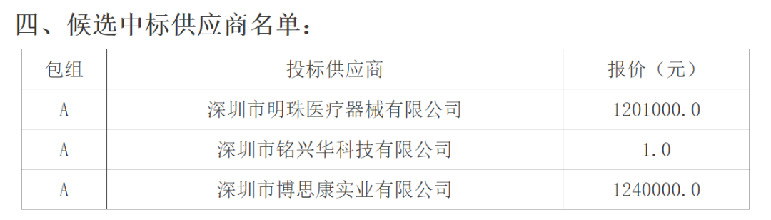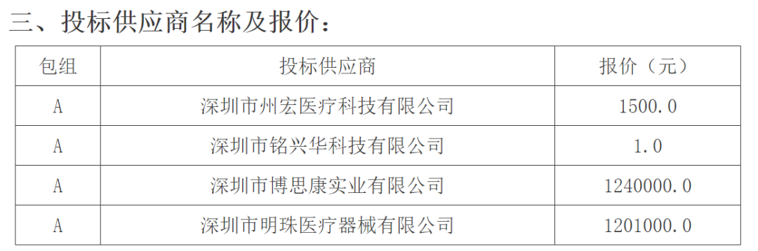 其中,通过审查的候选中标供应商有3家,包含报价1元的中标供应商深圳市铭兴华科技有限公司。