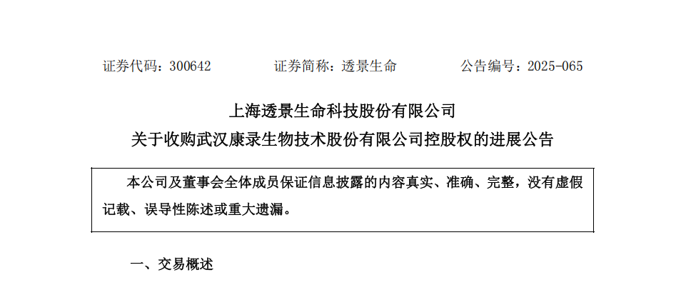 2025年9月29日——上海透景生命科技股份有限公司(证券代码:300642,证券简称:透景生命)今日发布公告,宣布已完成对武汉康录生物技术股份有限公司控股权的首阶段收购交割工作,标志着其在分子诊断领域的战略布局取得实质性进展。