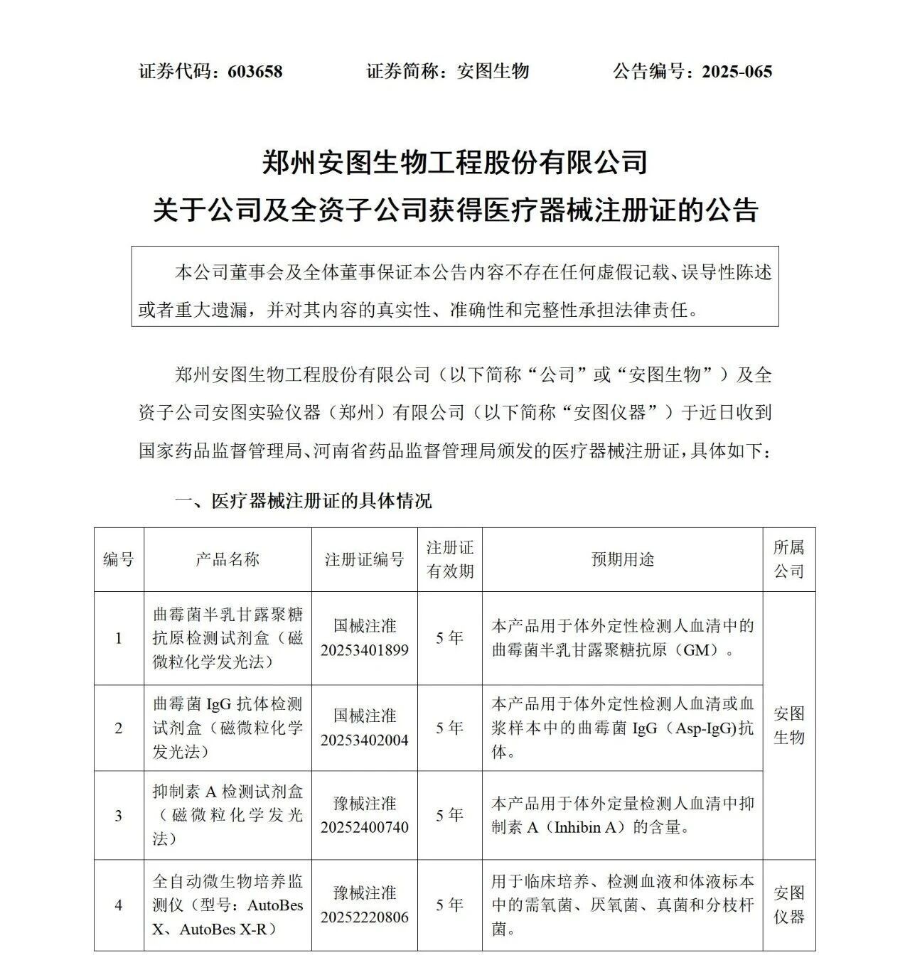 近期,安图生物及全资子公司安图仪器新产品:曲霉菌半乳甘露聚糖抗原检测试剂盒(磁微粒化学发光法)、曲霉菌IgG抗体检测试剂盒(磁微粒化学发光法)、抑制素A检测试剂盒(磁微粒化学发光法)全自动微生物培养监测仪(型号:AutoBes X、AutoBes X-R)获国家药品监督管理局、河南省药品监督管理局颁发的医疗器械注册证。新产品注册证的取得,进一步丰富公司产品线,不断满足市场需求。