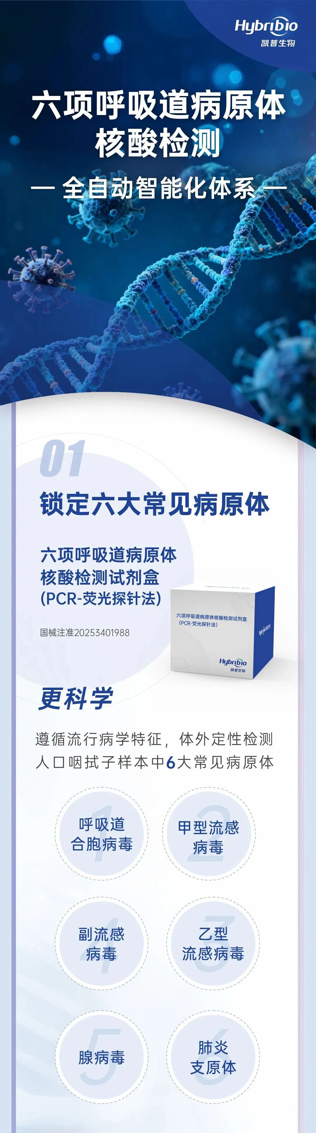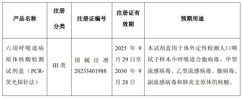 该注册证涉及的产品为“六项呼吸道病原体核酸检测试剂盒(PCR-荧光探针法)”,注册证编号为国械注准20253401988,有效期自2025年9月29日至2030年9月28日。该产品用于体外定性检测人口咽拭子样本中的呼吸道合胞病毒、甲型流感病毒、乙型流感病毒、副流感病毒、腺病毒、肺炎支原体,为当前呼吸道感染鉴别诊断提供了高效工具。