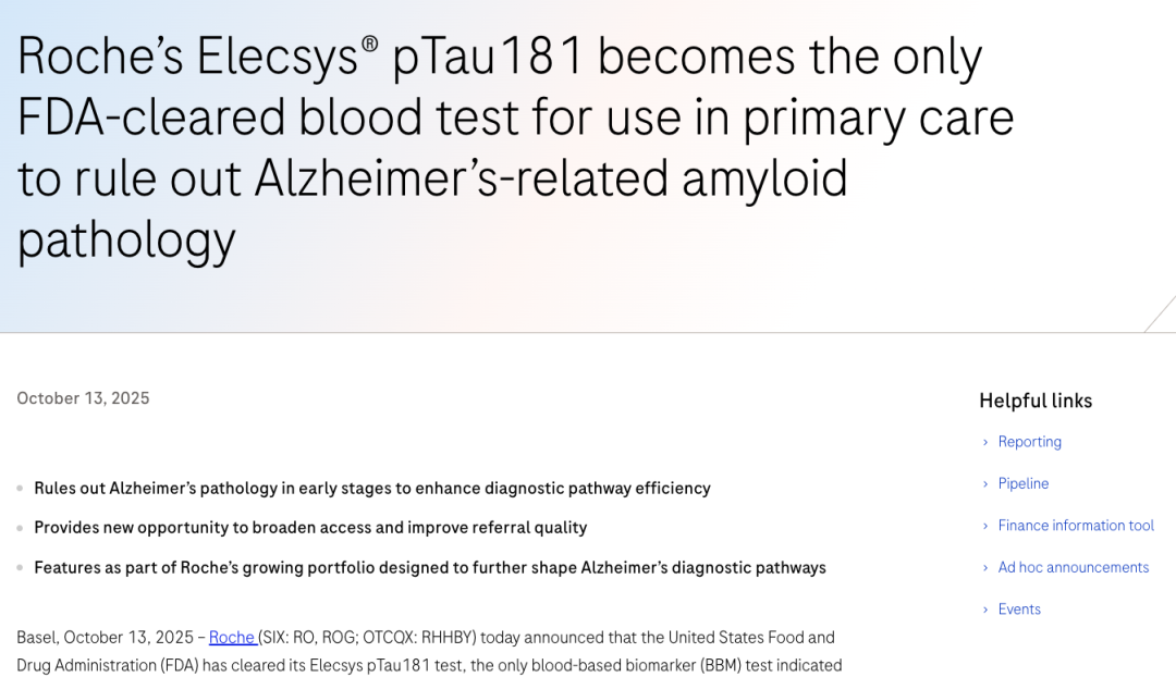 罗氏在声明中表示,该检测适用于55岁及以上出现认知衰退迹象或症状的患者。通过测量人血浆中的磷酸化Tau 181蛋白——一种与阿尔茨海默病病理(包括淀粉样斑块和Tau蛋白聚集)相关的生物标志物,该检测可帮助识别在认知衰退早期阶段、且不太可能患有阿尔茨海默病相关淀粉样蛋白病变的患者。
