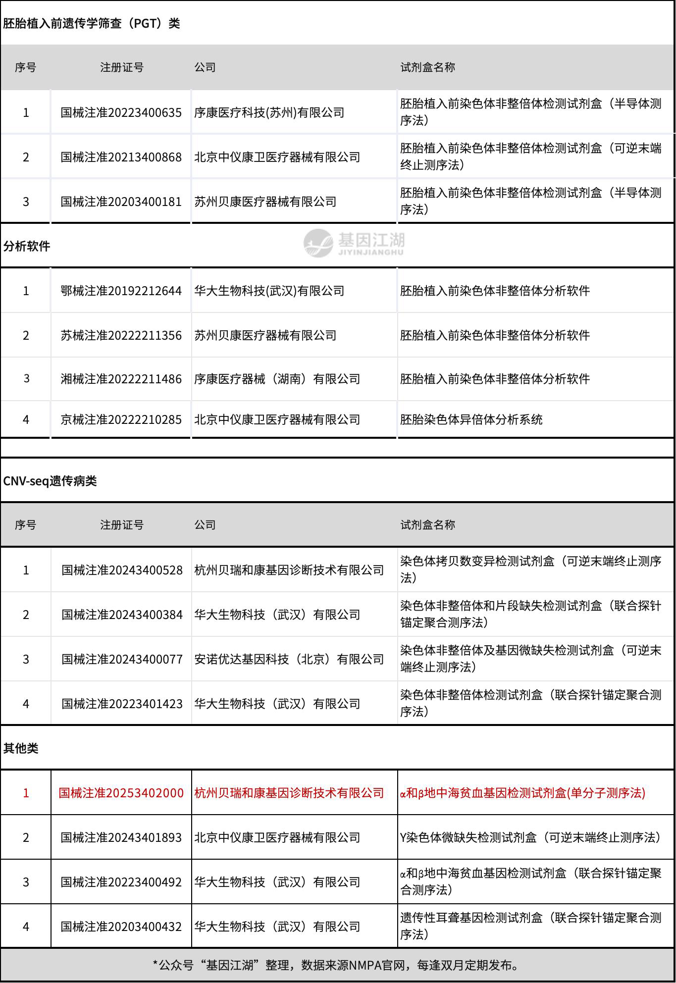 - 统计周期内,贝瑞基因, - (1)大通量基因测序仪NovaSeqTM 6000Dx-CN-BG获批上市; - (2)基于PacBio平台的 α和β地中海贫血基因检测试剂盒(单分子测序法) 及其分析软件获批上市,这也是国内首个基于长度长测序方法学获批上市的产品。