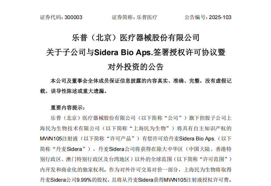 一则看似普通的医药授权公告,背后竟隐藏着一场颠覆全球代谢病治疗格局的“豪赌”。乐普医疗子公司上海民为生物,将一支尚未上市的中国原创注射液,以“股权+百亿里程碑付款”的方式授权给丹麦公司,撬动了海外市场的巨轮。这不仅是GLP-1赛道的新爆点,更是中国创新药“反向出海”的里程碑!10月31日,乐普医疗发布公告,其控股子公司上海民为生物与丹麦Sidera Bio Aps.签署授权许可协议:独家权利:丹麦Sidera获得MWN105注射液在除大中华区以外的全球开发与商业化权益; 股权置换:上海民为生物直接获得丹麦Sidera公司9.99%股权; 巨额付款:首笔投资与近期里程碑款合计3500万美元,后续临床与销售里程碑款累计不超过10.1亿美元; 销售分成:按净销售额分梯收取提成,覆盖全球市场(除大中华区)。这笔交易,不仅是“技术换股权”的典型范本,更标志着中国药企从“引进来”转向“走出去”的质变。为何一支尚在临床早期的注射液,能让丹麦公司押注百亿? 三重激动剂:MWN105是GLP-1/GIP/FGF21受体三重激动剂,瞄准糖尿病、肥胖症及代谢性疾病,被业内称为“代谢赛道下一代重磅炸弹”; 临床进展:2024年11月与2025年3月已获中国国家药监局临床试验批准,国内试验稳步推进; 全球缺口:当前全球GLP-1药物市场由诺和诺德、礼来主导,但多靶点药物仍属蓝海,MWN105有望实现“弯道超车”。有评论称:“这不仅是卖药,更是中国创新药企首次以‘技术主权’切入全球研发核心圈。”从“代工”到“授权”:过去中国药企多以生产代工参与国际分工,如今以原创技术主导全球权益分配; 从“卖药”到“占股”:通过股权绑定,中国药企深度参与海外公司治理,共享长期价值; 从“单打”到“联盟”:双方设立联合管理委员会,协调全球开发与商业化,形成利益共同体。一位行业分析师指出:“乐普此举,为中国创新药‘带技术出海’打了样。”临床不确定性:MWN105尚处早期临床,海外审批周期长、变数多; 里程碑依赖:10.1亿美元付款需满足特定临床与销售条件,实际金额存疑; 国际竞争白热化:礼来、诺和诺德等巨头已布局多靶点药物,未来市场厮杀激烈。然而,若成功上市,MWN105不仅将填补全球代谢病治疗空白,更可能成为中国创新药登顶全球的“代表作”。 “从前是我们买国外技术,如今轮到别人买我们的——这波文化输出,硬核!” “9.99%股权+百亿分红,这哪是卖药?这是去当丹麦公司的‘老板’啊!” “希望中国药企继续‘卷’向世界,让全球患者用上中国方案!”结语:一场由中国药企主导的全球创新革命,才刚刚开始 乐普医疗与丹麦Sidera的合作,不仅是商业交易,更是中国医药工业从“跟跑”到“并跑”乃至“领跑”的转折点。当中国注射液成为海外巨头的“战略筹码”,我们看到的,不仅是一支药的未来,更是一个行业站上世界舞台中央的野心与底气。10月24日,乐普医疗公布2025年三季报:2025年前三季度,公司营业收入为49.4亿元,同比上升3.2%;归母净利润为9.82亿元,同比上升22.4%;扣非归母净利润为9.41亿元,同比上升28.2%。