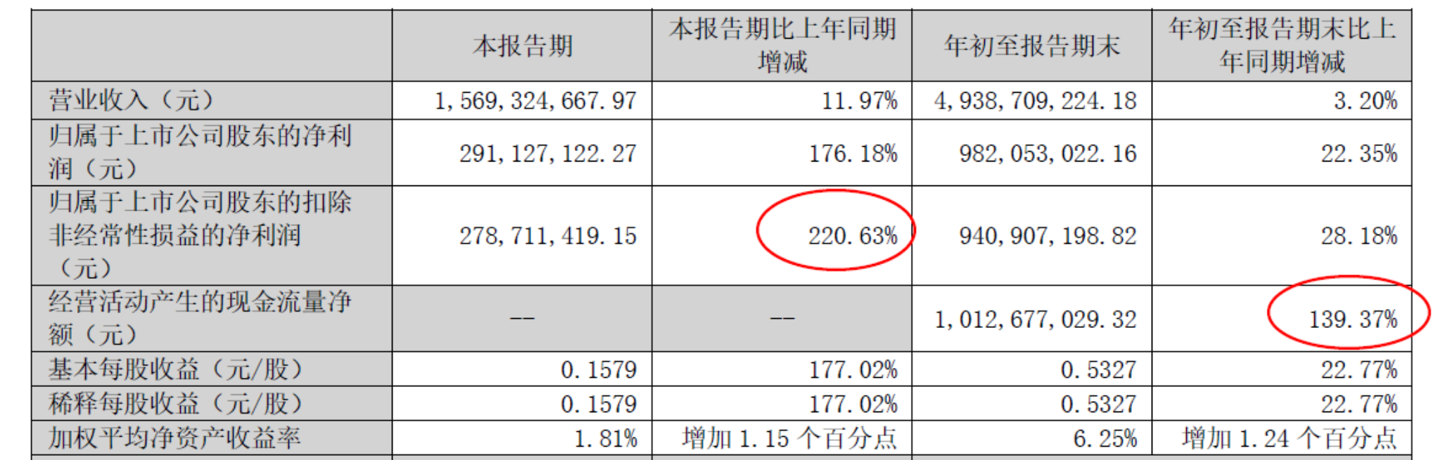 其中,第三季度数据亮眼:公司营业收入为15.7亿元,同比上升12.0%;归母净利润为2.91亿元,同比上升176.2%;扣非归母净利润为2.79亿元,同比上升220.6%;每股收益为0.1548元。