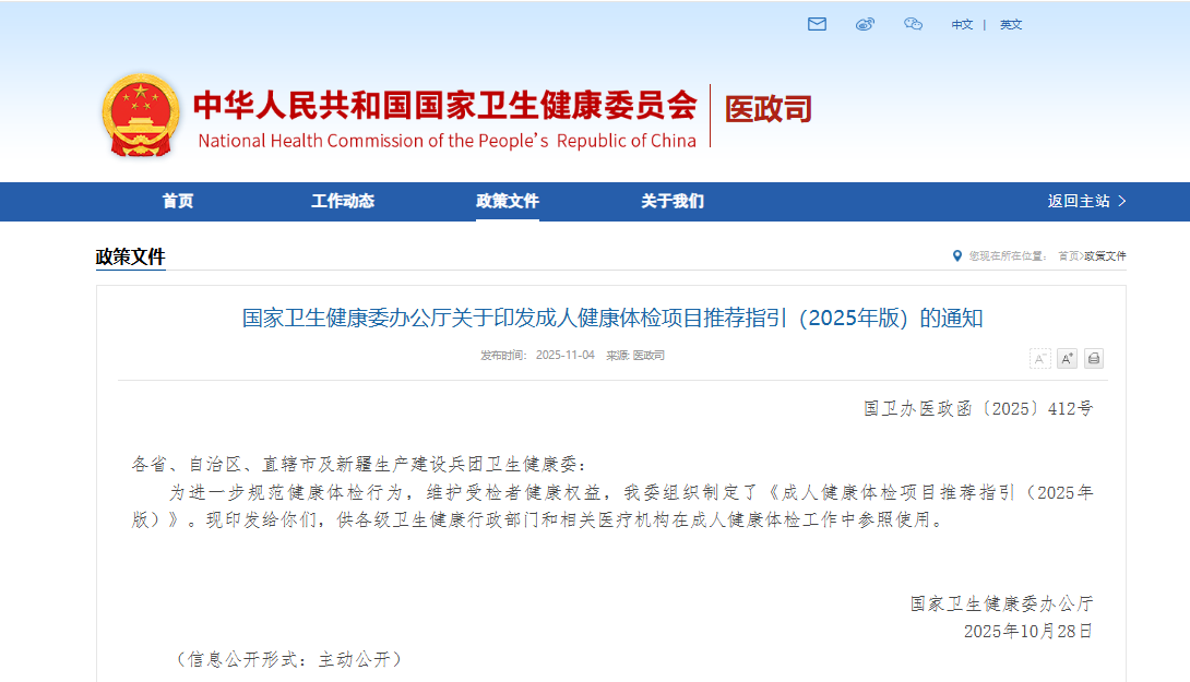 11月4日,国家卫生健康委办公厅正式印发《成人健康体检项目推荐指引(2025年版)》(以下简称《指引》),系统更新了成人健康体检的基本项目与慢性病风险筛查体系,进一步推动体检服务的标准化、个性化和科学化。