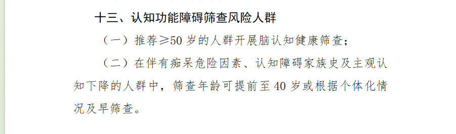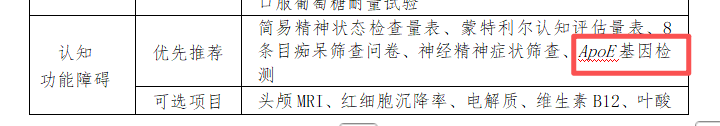值得关注的是,本次《指引》显著加强了对脑健康与认知障碍的筛查推荐。根据配套发布的《常见慢性病风险评估指标》,推荐≥50岁人群应开展脑认知健康筛查,而对于伴有痴呆危险因素、认知障碍家族史及主观认知下降的人群,筛查年龄可提前至40岁。在筛查项目上,ApoE基因检测被列为“优先推荐”的分子检测项目,与简易精神状态检查量表(MMSE)、蒙特利尔认知评估量表(MoCA)等共同构成早期风险评估组合。此外,维生素B12、叶酸等营养状态及电解质水平的检测也被纳入“可选项目”,为探寻认知障碍的可干预因素提供了实验室依据。