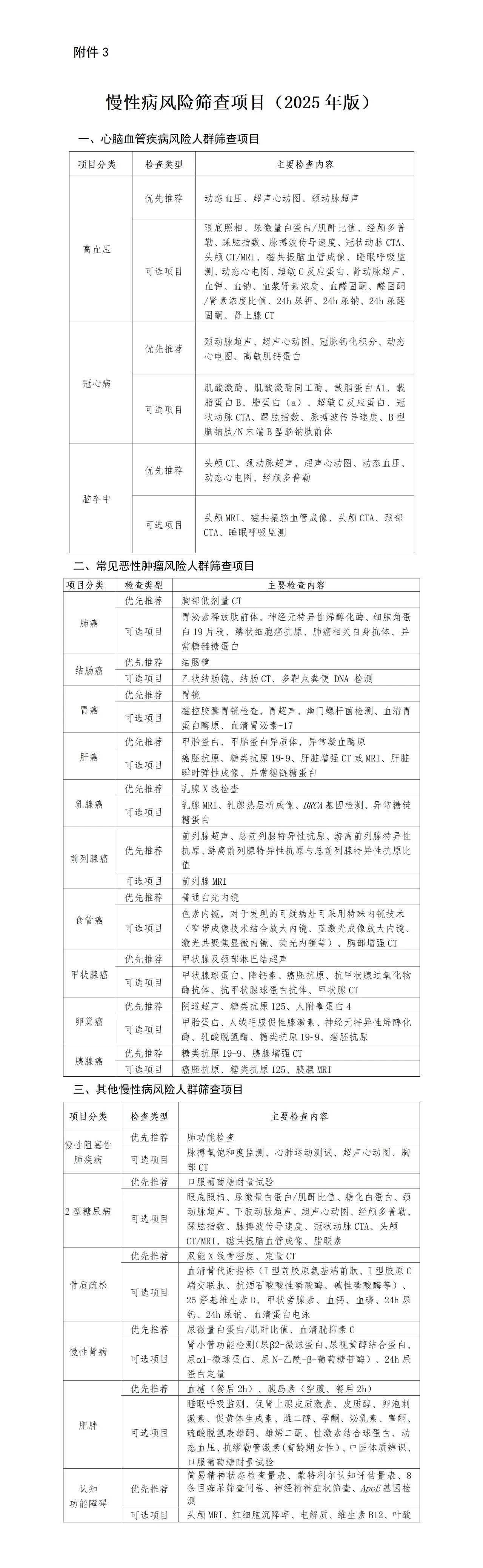 《指引》明确将基本体检项目与慢性病风险筛查项目分离,强调在基本检查基础上,结合问卷评估结果,为高风险人群提供更具针对性的深度筛查。这一变化显著提升了对心脑血管疾病、常见恶性肿瘤、糖尿病、慢性阻塞性肺疾病等慢性病,以及认知功能障碍的早期识别与干预能力。