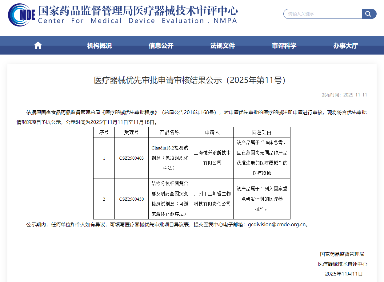 2025年11月11日,上海恺兴诊断技术有限公司的“Claudin18.2检测试剂盒(免疫组织化学法)”进入优先通道公示,其同意理由为“该产品属于“临床急需,且在我国尚无同品种产品获准注册的医疗器械”的医疗器械”。