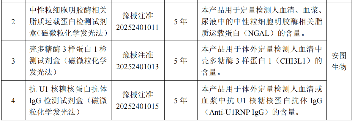 除基因测序仪外,安图生物本体此次还获得了三项检测试剂盒的注册证,均采用磁微粒化学发光法: