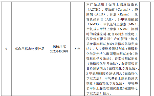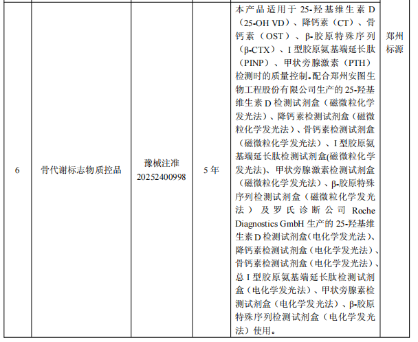 此外,二级子公司郑州标源获得了“高血压标志物质控品”与“骨代谢标志物质控品”的注册证。这两款质控品用于相关激素及标志物检测过程的质量控制,其设计不仅兼容安图生物自产的检测试剂盒,骨代谢质控品还特别标注可兼容罗氏诊断公司的相关电化学发光检测产品,体现了其对实验室质量控制体系的广泛支持意图。
