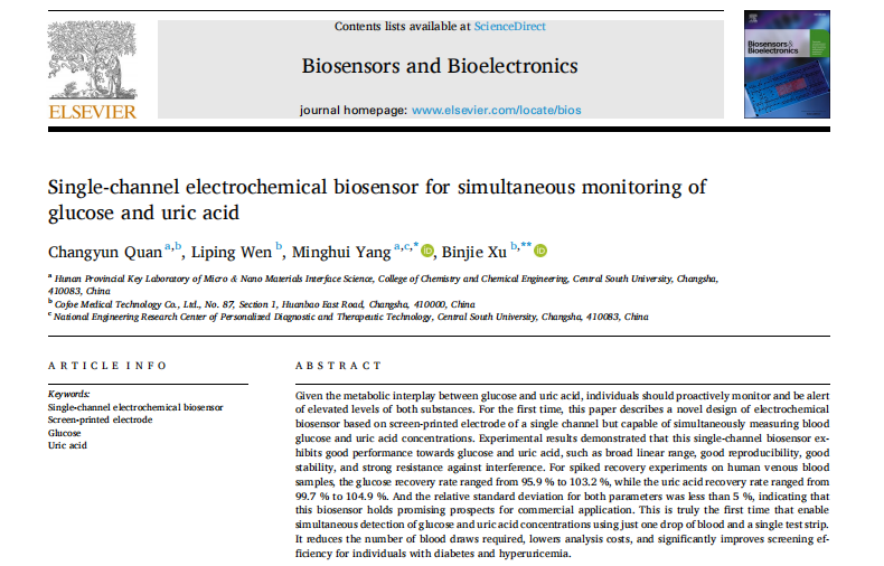 公司自主研发的“用于同步检测葡萄糖和尿酸的单通道电化学生物传感器”技术,其核心研究成果以题为《Single-channel electrochemical biosensor for simultaneous monitoring of glucose and uric acid》的学术论文,成功发表于生物传感领域国际顶级期刊《Biosensors and Bioelectronics》。