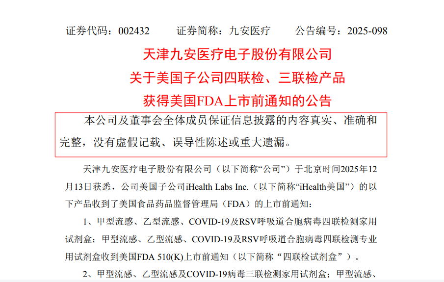 新闻来源:根据《天津九安医疗电子股份有限公司关于美国子公司四联检、三联检产品获得美国FDA上市前通知的公告》(公告编号:2025-098)整理。