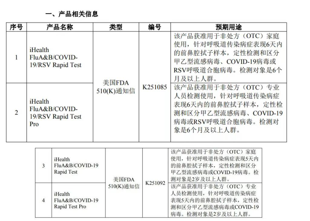 来源: 根据《天津九安医疗电子股份有限公司关于美国子公司四联检、三联检产品获得美国FDA上市前通知的公告》(公告编号:2025-098)整理