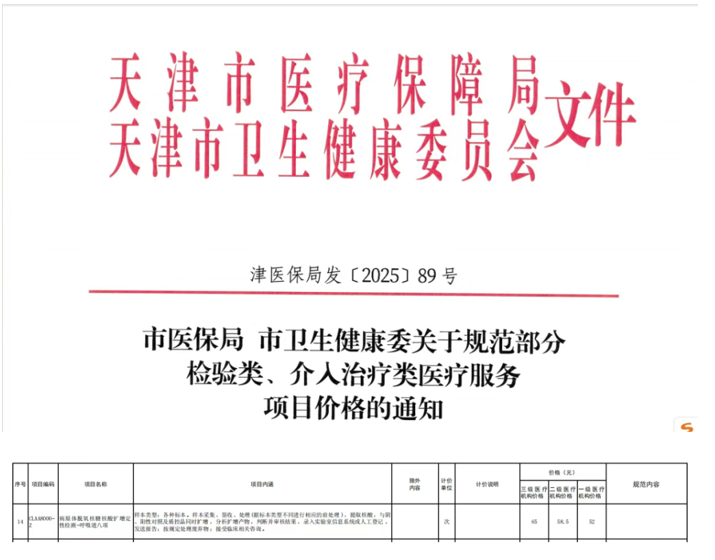 CLAA8000-Z,病原体脱氧核糖核酸扩增定性检测-呼吸道八项,计价单位:次,三级医院限价65元,二级58.5元,一级医院52元。