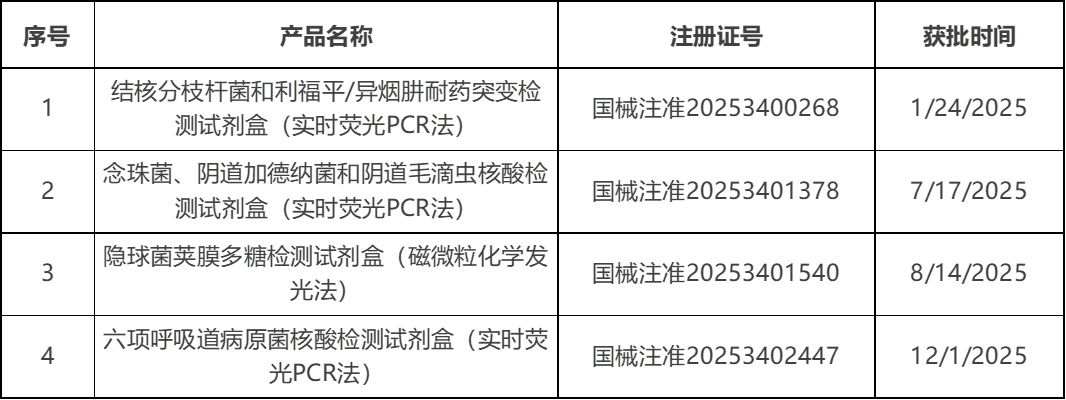 12月5日,创澜生物的“六项呼吸道病原菌核酸检测试剂盒(实时荧光PCR法)”正式获批上市(国械注准20253402447),这已经是创澜生物今年获批的第4款三类注册证,也是创澜收获的第十张三类医疗器械注册证。