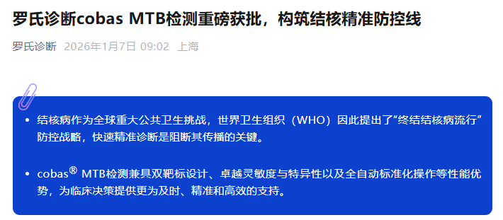2026年1月初,罗氏诊断中国连续迎来两大里程碑——继国产cobas? 5800全自动分子诊断系统获批后,其配套的cobas? MTB结核分枝杆菌核酸检测试剂盒也正式获得国家药品监督管理局批准。这标志着罗氏诊断在感染性疾病分子诊断领域实现重大突破,正式进军中国结核病精准防控赛道。结核病仍是全球重大公共卫生挑战之一。在中国,结核病防控正从“被动发现”转向“主动筛查”,对快速、精准的诊断工具需求迫切。此次获批的cobas? MTB检测基于实时PCR技术,采用16S rRNA基因与多拷贝esx基因双靶标设计,显著提升了检测灵敏度和覆盖范围。其在原始溶液样本中检出限低至8.8 CFU/mL,能有效识别低菌载量的早期感染,助力实现早筛早诊。该检测适用于罗氏诊断全自动分子诊断系统cobas? 5800/6800/8800,实现“样本进、结果出”的全流程自动化,大幅提升检测效率与标准化水平,可满足疾控中心、医院等不同规模机构的检测需求。就在cobas? MTB获批前一天,罗氏诊断宣布国产cobas? 5800系统正式获NMPA批准。该系统在苏州罗氏诊断亚太生产基地研发生产,占地仅一平方米,支持多项目并行检测,8小时可输出144个结果,兼顾高效、灵活与质量可控,为结核等感染性疾病的分子诊断提供了坚实的硬件支撑。罗氏诊断中国总经理姚国樑表示,cobas? MTB的获批是公司在感染领域分子诊断布局的重要突破。依托国产化cobas? 5800系统,罗氏将进一步加速创新诊断技术在中国落地,助力提升结核病防控能力。根据《全国结核病防治规划(2024—2030年)》,我国提出到2030年将结核病发病率控制在43/10万以下,并推动新技术在主动筛查中的应用。罗氏诊断此次推出的检测与系统组合,正是对国家精准防控战略的积极响应,也为实现世界卫生组织“终结结核病流行”目标提供了有力的诊断技术支持。随着cobas? MTB与国产cobas? 5800的相继获批,罗氏诊断在中国结核病诊断领域已完成从技术到产品的闭环布局,有望在结核病早期发现、精准治疗和防控管理中发挥重要作用,守护更多患者生命健康。声明:本微信注明来源的稿件均为转载,仅用于分享,不代表平台立场,如涉及版权等问题,请尽快联系我们,我们第一时间更正。