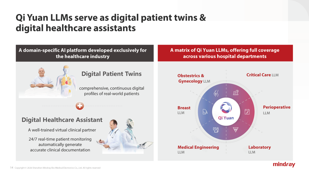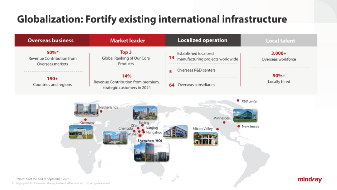 全球化蓝图、流水业务扩张、数智化转型的三角战略已经清晰地绘制在迈瑞医疗未来十年的增长版图上。摩根大通全球医疗健康大会上,迈瑞医疗首次系统公布了公司未来十年的增长蓝图。公司董事会秘书李文楣透露,公司未来增长将围绕“加速全球化”“流水业务拓展”“数智化转型”这三大核心支柱展开。这不仅是迈瑞针对自身发展的战略升级,也透露出中国医疗器械龙头企业应对全球变局、提升国际竞争力的深层思考。迈瑞医疗全球化战略迎来新的里程碑。“加速全球化”被明确为公司未来增长的核心支柱。李文楣在演讲中透露,迈瑞医疗设定了清晰的全球化进阶目标:将国际业务收入占比从当前的50% 提升至 60% 以上。这意味着未来迈瑞的国际业务比重将超过国内业务,这是其成为全球医械巨头的必经之路。迈瑞的国际业务版图已相当可观。截至目前,其产品和服务覆盖全球190多个国家和地区,已在全球40多个国家搭建起64家子公司、5个研发中心、14个生产基地的全球化网络。国际员工队伍突破3000人,其中90%以上为本地员工。“不同于传统跨国企业的营销导向模式,公司秉持深度本土化理念。”李文楣强调,在新兴市场,迈瑞尤其注重赋能本地医疗能力建设。例如在中东和非洲地区,已建立20多个超声培训学校,为当地培养并认证数千名超声临床医生。在关税、贸易壁垒与供应链风险加剧的背景下,加快建设海外平台成为国际业务长期主义的关键。李文楣表示,公司正通过推进本地生产、供应链采购与研发的全方位落地,稳步实现从单纯的医疗设备供应商向赋能全球医疗系统的战略合作伙伴转型。流水业务(或称耗材业务)是迈瑞医疗未来增长的第二个核心支柱。该业务涵盖IVD试剂、微创手术耗材、微创介入耗材、IT与用户服务等,2025年上半年已贡献公司总营收的40%。2024年,迈瑞体外诊断领域在国内可及市场的占有率不及15%,在全球可及市场中占有率约为4%;微创外科和微创介入在全球可及市场中占有率仅0.8%。李文楣坦言,除了IVD仍有巨大的市占率提升空间以外,公司的微创外科、微创介入等耗材业务目前的占有率甚至可以忽略不计,而这两块业务的合计市场容量大于IVD,行业仍有很大的成长空间。为加速流水业务突围,迈瑞正从全球供应链布局与业务生态构建双向发力。一方面,公司积极推进海外本地化供应链与生产设施建设;另一方面,精准布局赛道扩容。公司通过收购惠泰医疗成功切入心血管介入领域,同时规划构建涵盖经皮、经自然腔道、经呼吸道等多介入路径的“泛介入治疗”生态。在微创外科领域,在聚焦胸外科与普外科的基础上,进一步向妇科、泌尿外科等多科室延伸,并重点研发适配各科室临床需求的手术机器人。“数智化转型”是迈瑞医疗未来十年增长的第三大核心支柱。李文楣指出,迈瑞的数智化解决方案构建了清晰的五层架构。前四层已落地应用,第五层正处于研发攻坚阶段:第一层为设备基础层,第二层为设备融合层,第三层为IT系统层,第四层为AI层,第五层为闭环自强化层。2024年底,迈瑞推出了“启元”医学大模型家族,应用从重症监护拓展至围手术期、乳腺超声、妇产超声、IVD检验、医工管理等多个领域。据李文楣介绍,“启元”医学大模型具备双重核心能力:一方面可构建患者“数字孪生体”,另一方面能充当“智能医疗助手”。提供7×24小时实时患者监护、自动生成精准临床文书,为多场景医护人员提供高风险场景下的关键决策支持。值得关注的是,所有AI大模型均采用本地部署模式,全力保障患者隐私安全。李文楣特别强调了“具身智能”在迈瑞未来战略中的核心地位。“具身智能”在“十五五”规划建议中被列为前瞻布局的未来产业之一。李文楣阐释了迈瑞对“具身智能”的理解:设备作为“感官”采集数据,IT系统作为“神经”传输整合数据,AI作为“大脑”生成辅助诊疗决策并反馈给设备硬件完成执行。未来“黑灯工厂”实验室、智能麻醉机器人、智能超声机器人等前沿产品将逐步在迈瑞落地。这些创新将直接挑战医疗领域的“不可能三角”——即质量、可及性与成本之间的传统矛盾。目前,迈瑞的数智化解决方案已在全球多个地区验证了其价值。在挪威,miCare与mWear可穿戴设备助力当地医院提升监护效率;在沙特,miImaging为全球最大虚拟医院提供支撑;在中国四川,miInnlab构建的“2+6+X”江油区检模式成为全国基层医疗协作标杆。在上海仁济医院,搭载“启元”医学大模型的数智医疗中心解决方案,使肝移植手术时间缩短约50%。李文楣在总结中强调,迈瑞医疗的三大增长支柱不是孤立的,而是相辅相成、协同发力的有机整体。全球化布局为流水业务拓展提供了市场基础,数智化转型则为两者注入了科技动能。这一战略规划的公布,标志着迈瑞医疗从中国领先的医疗器械企业向全球医疗科技领导者的转型已进入加速期。参考资料:迈瑞医疗