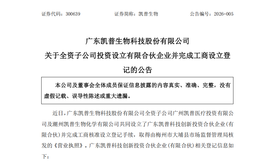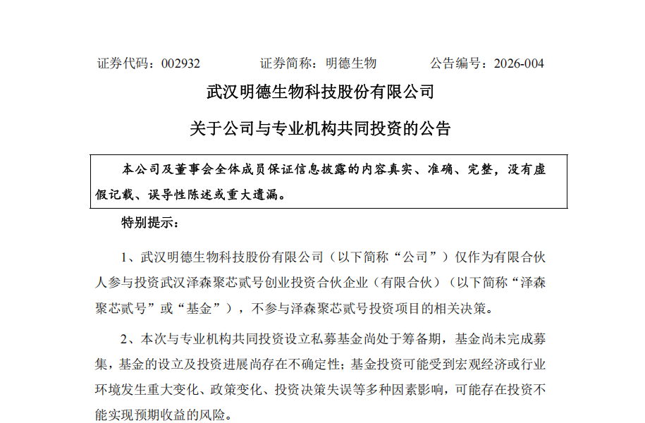 近日,两家A股IVD公司相继发布公告,宣布通过设立或参与产业投资基金进行对外投资,展现出在主营业务外积极拓展投资布局的战略动向。1月21日,广东凯普生物科技股份有限公司发布公告称,其全资子公司广州凯普医疗投资有限公司与潮州凯普生物化学有限公司共同投资设立的“广东凯普科技创新投资合伙企业(有限合伙)”已完成工商设立登记。该基金为有限合伙企业,执行事务合伙人为广州凯普医疗投资有限公司,出资总额为人民币1亿元。其中,广州凯普医疗投资有限公司作为普通合伙人出资100万元,持股1%;潮州凯普生物化学有限公司作为有限合伙人出资9900万元,持股99%。基金经营范围主要包括以自有资金从事投资活动及信息咨询服务。同日,武汉明德生物科技股份有限公司公告,公司与专业投资机构及其他投资者共同签署协议,参与投资“武汉泽森聚芯贰号创业投资合伙企业(有限合伙)”。该基金已完成工商注册,总规模为9500万元。明德生物作为有限合伙人,以自有资金认缴出资3000万元,占基金总规模的31.5789%。该基金的普通合伙人及基金管理人为武汉泽森长盛创业投资基金管理有限公司。根据公告,基金的投资方向将重点关注光互联、半导体等人工智能基础设施及终端产业链。明德生物在公告中提示了相关风险,包括基金尚处筹备期、募集未完成、投资标的寻找及收益不达预期等不确定性。公司表示,此次投资旨在借助专业机构资源,完善投资布局,分享新兴赛道成长红利,为股东创造多元收益。两家生物科技公司不约而同在2026年开年进行投资布局,反映了在IVD(体外诊断)行业经历前期市场波动后,相关企业正积极利用自有资金,通过直接投资或借助专业机构力量,探索主业之外的战略性投资机会,以培育新的利润增长点,提升综合竞争力和资产回报率。凯普的基金暂未明确具体投资领域,而明德生物则明确指向了当前热门的半导体及人工智能硬件产业链,显示出跨界寻求技术协同或财务回报的意图。声明:本微信注明来源的稿件均为转载,仅用于分享,不代表平台立场,如涉及版权等问题,请尽快联系我们,我们第一时间更正。