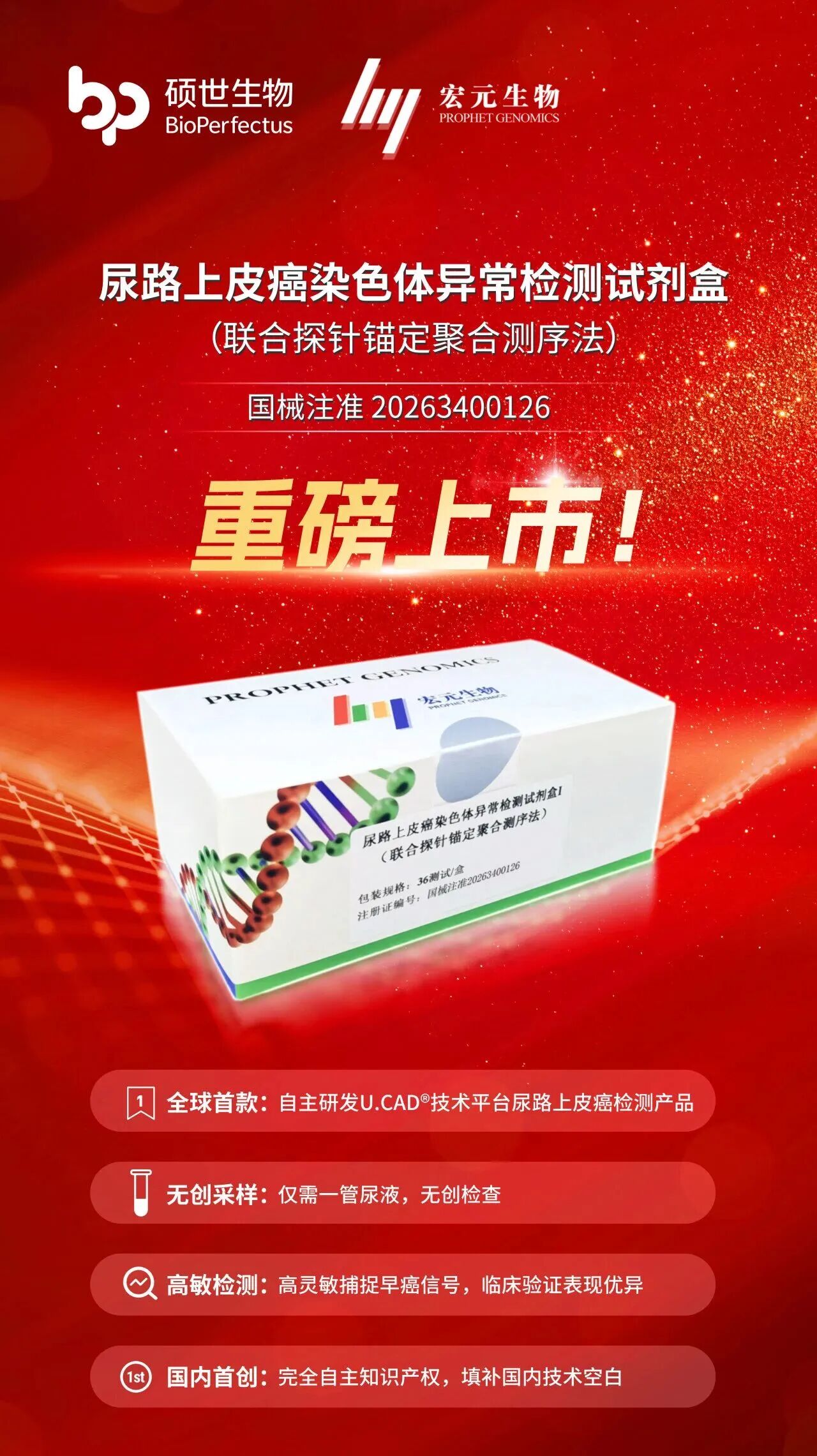2026年1月20日,苏州宏元生物科技有限公司自主研发的“尿路上皮癌染色体异常检测试剂盒(联合探针锚定聚合测序法)”(商品名:U.CAD?)正式获得国家药品监督管理局三类医疗器械注册证(国械注准20263400126)。该产品是国内首个基于超灵敏度染色体不稳定性检测(U.CAD?)技术平台孵化的尿路上皮癌无创检测产品,标志着我国在肿瘤早诊领域从“技术跟随”迈向“原创引领”的关键一步。