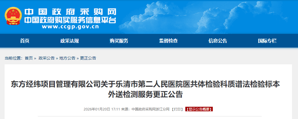 2026年01月20日,中国政府采购网发布关于乐清市第二人民医院医共体检验科质谱法检验标本外送检测服务更正公告。
