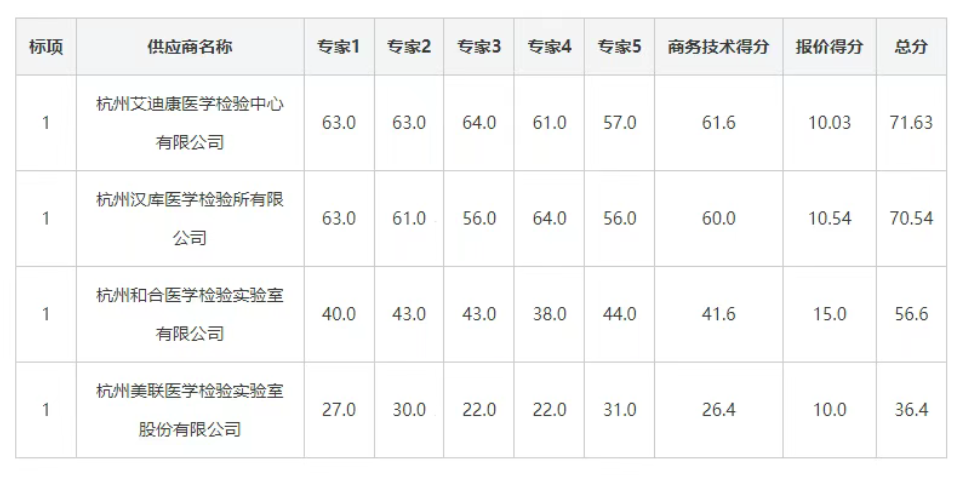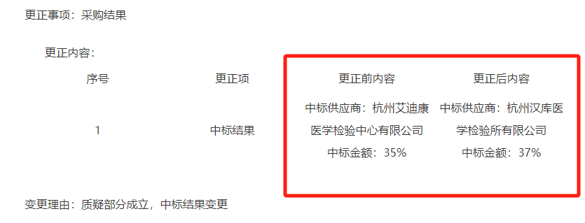 原中标供应商:杭州艾迪康医学检验中心有限公司,变更为杭州汉库医学检验所有限公司,中标金额:37%