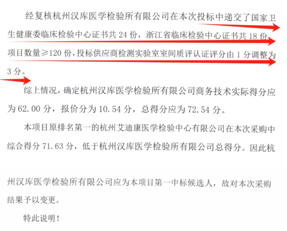 经复核杭州汉库医学检验所有限公司在本次投标中递交了国家卫生健康委临床检验中心证书共24份,浙江省临床检验中心证书共18份,项目数量≥120份,投标供应商检测实验室室间质评认证评分由1分调整为3分。
