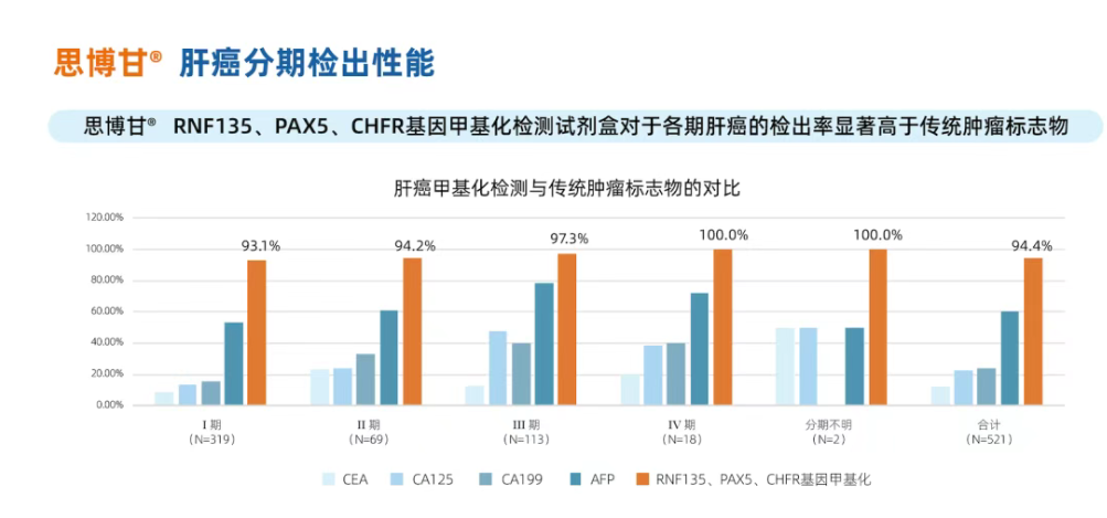 数据显示,思博甘?灵敏度为94.4%、特异性为94.3%,其中I期肝癌检出率高达93.1%,肝细胞癌检出率为94.6%,显著优于AFP、CEA等传统肿瘤标志物,有效破解肝癌早检传统手段灵敏度不足的困局。