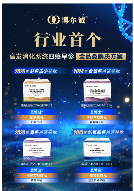 2026年1月23日,博尔诚肝癌甲基化早诊产品——思博甘?RNF135、PAX5、CHFR基因甲基化检测试剂盒(PCR荧光探针法)获批上市(国械注准20263400163)。