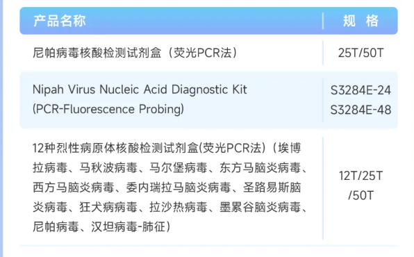 达安基因深耕传染病核酸检测领域多年,在历次新发和突发公共卫生事件中均有突出贡献。中山市达安基因生物科技有限公司(达安基因旗下子公司)现已研制出“尼帕病毒核酸检测试剂盒(荧光PCR法)”,可助力海关、疾控等机构精准防控尼帕病毒疫情。