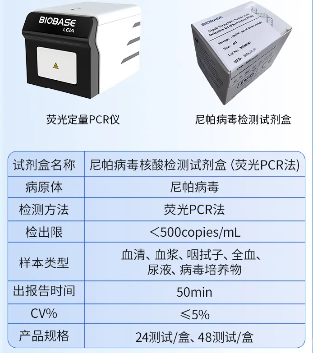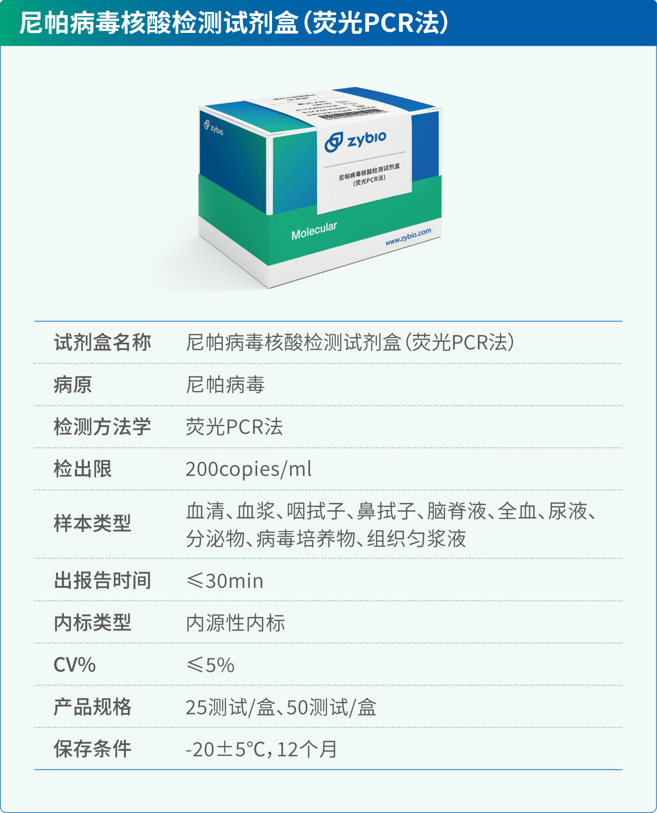 荣畅吉诺提供尼帕病毒核酸检测试剂盒:灵敏度高,特异性强,操作简便;可覆盖检测M亚型(马来西亚)和B亚型(孟加拉)两个亚型,用于尼帕病毒实验室快速检测和预防监测。
