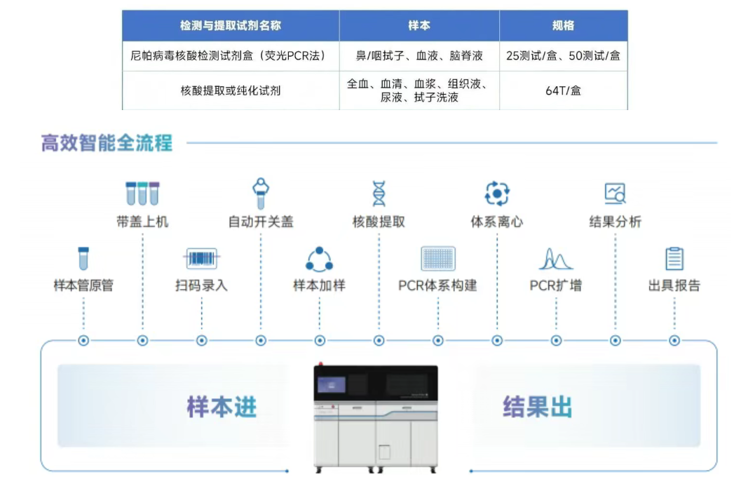 面对此次尼帕病毒疫情,博科集团推出了多平台解决方案,全自动核酸检测、高通量免疫检测、快速呼吸道胶体金等,以快速响应彰显中国企业的责任与担当。依托核酸检测优势,博科集团提供从样本采集、快速筛查到精准分析的完整检测方案,70分钟极速确诊。