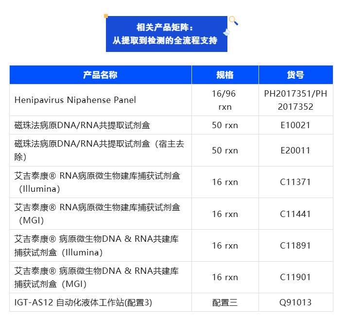 针对这一需求,本公司推出探微?(MicroProbe)病原微生物全基因组探针捕获试剂盒与FocusPath?宏基因组DNA文库构建试剂盒专项解决方案,为尼帕病毒防控提供强力技术支撑。针对核酸检测样本为阳性的样本,可采用尼帕病毒病原微生物全基因组探针捕获试剂盒,本试剂盒覆盖病毒全基因组序列,对病毒随机变异包容度高,无需频繁升级探针,即使面对新变异株也能高效捕获,助力快速溯源与进化分析。针对核酸检测样本为阴性的样本,可采用宏基因组RNA文库构建试剂盒,本试剂盒具有超高灵敏度,不放过微量病原,全基因组覆盖,信息更全面,可用于新发/突发病原体的精准溯源,锁定传播链。